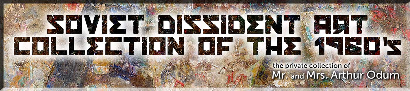 These paintings were acquired from the artists in Moscow over a two year period, 1967-1969, during my tenure as a diplomat at the U.S. Embassy there. To choose to be an unofficial artist in the Soviet Union and to engage in active protest against the regime, during a time of stringent totalitarian control of every aspect of public and private life, required considerable personal sacrifice. This exhibit is a tribute to the courage of these artists who refused to allow their individual expressions of life, freedom and thought to be suppressed.